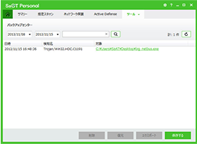 SaAT Personal で駆除した感染ファイルのバックアップを管理します。バックアップされたファイルは元の位置から退避され、SaAT Personal が安全に管理し、「確認」・「削除」・「復元」な状態になります。